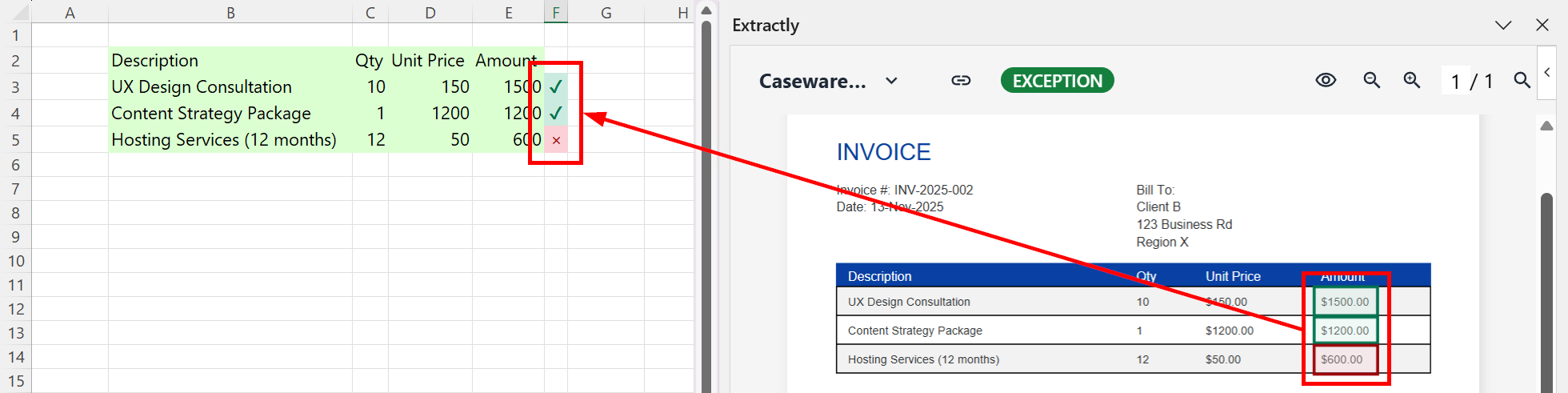 Use Validation and Exception to mark extracted content as correct (✓) or incorrect (✗) for quick review.