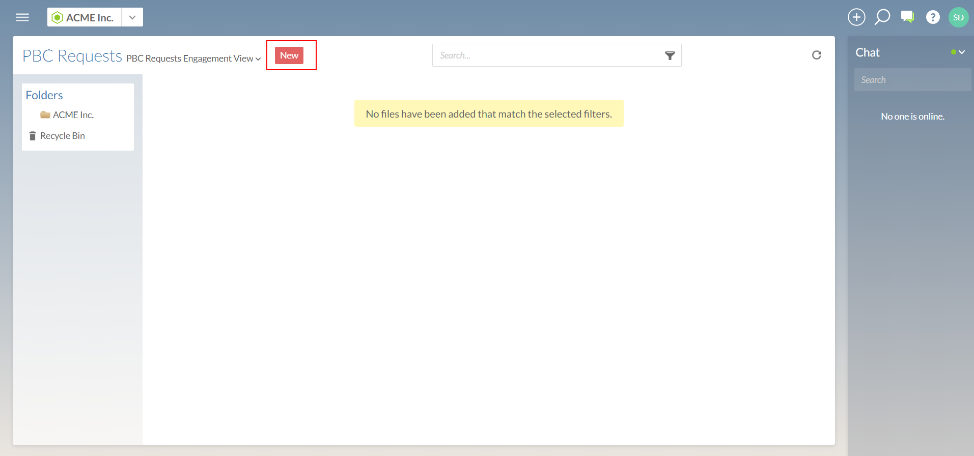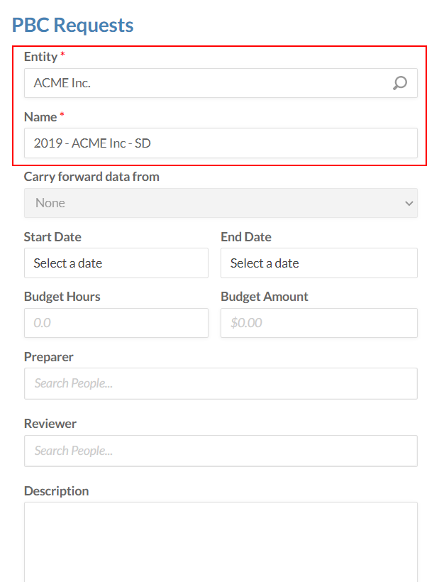 In the PBC Requests dialog, choose your client Entity and enter the Name for the engagement as shown below.