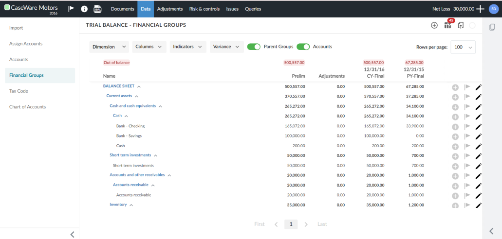 • Grupos financieros : muestra los grupos financieros. Esta es la estructura de agrupación por defecto a la que se asignan los datos del balance de sumas y saldos del cliente. Esta pestaña está siempre disponible una vez importados los datos del cliente. Tenga en cuenta que si su producto tiene varias estructuras de agrupación financiera, puede ver hasta tres pestañas de grupos financieros.