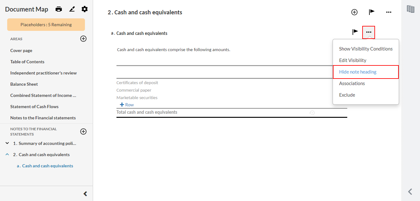 Para obtener más información, consulte Configuración de las opciones de impresión en los estados financieros y Ocultar encabezamientos de subnivel para una nota.