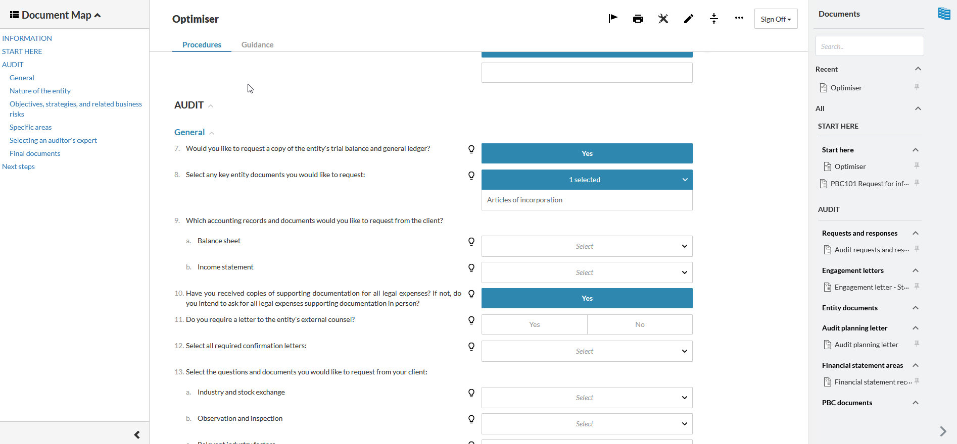 Si vous choisissez d' utiliser les modèles PBC, des questions et des demandes supplémentaires s'affichent dans l' Optimiseur. Par exemple, si vous répondez Audit à la question Quel est le type de mission réalisé , d'autres questions relatives aux missions d'audit vous sont posées.