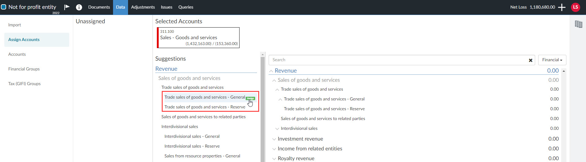Attribuez vos comptes. Pour le compte Ventes - marchandises et services , vous avez la possibilité de l'affecter au compte Ventes commerciales de marchandises et services - général ou Ventes commerciales de marchandises et services - fonds de réserve .