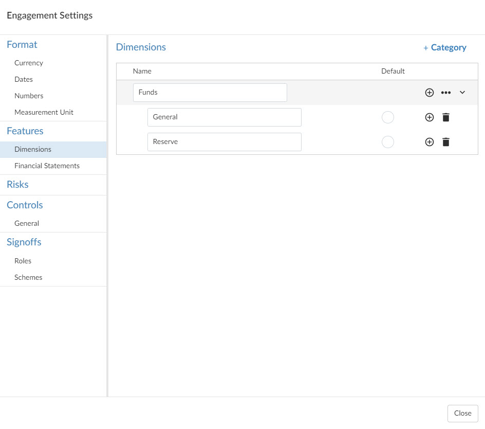 Dans cet exemple, nous avons ajouté la catégorie Fonds avec les dimensions Général et Réserve . Nous pouvons maintenant affecter les catégories de dimensions aux groupes financiers.