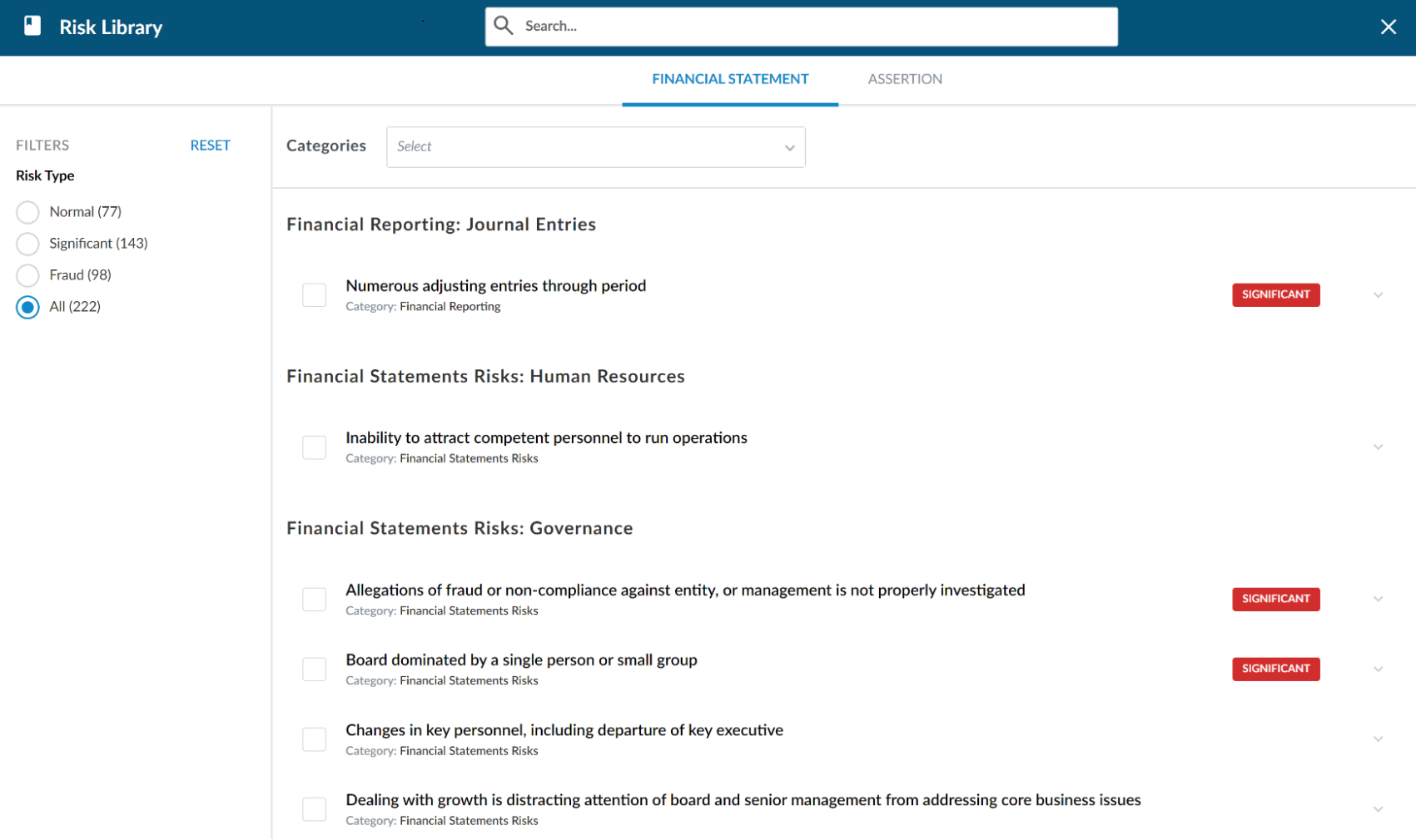 Select the appropriate level of risk. Select the Financial Statement level if the risk has a pervasive effect on the financial statements and potentially affects many assertions. Select the Assertion level if the risk affects a specific financial statement area.
