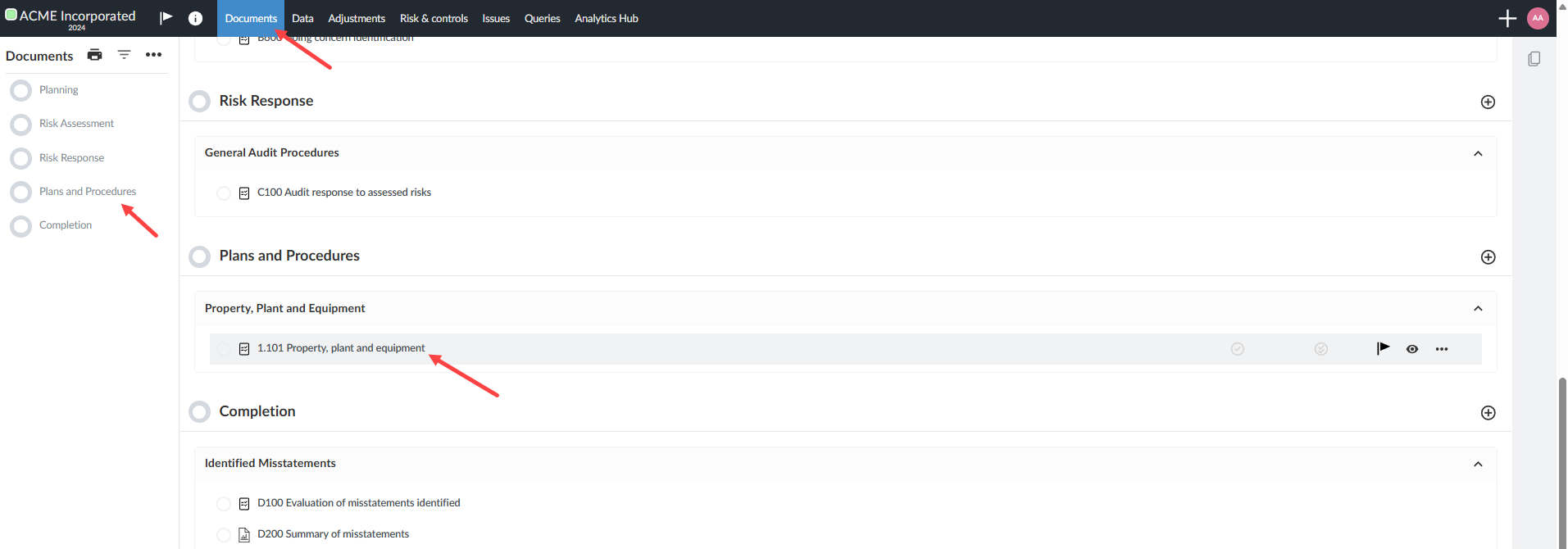 2. Click a document that has analysis enabled. In the example below, the document Property, plant and equipment is selected under the Plans and Procedures section of the Documents page.