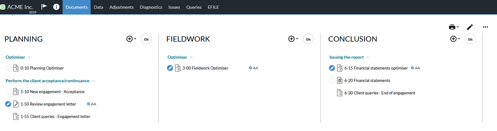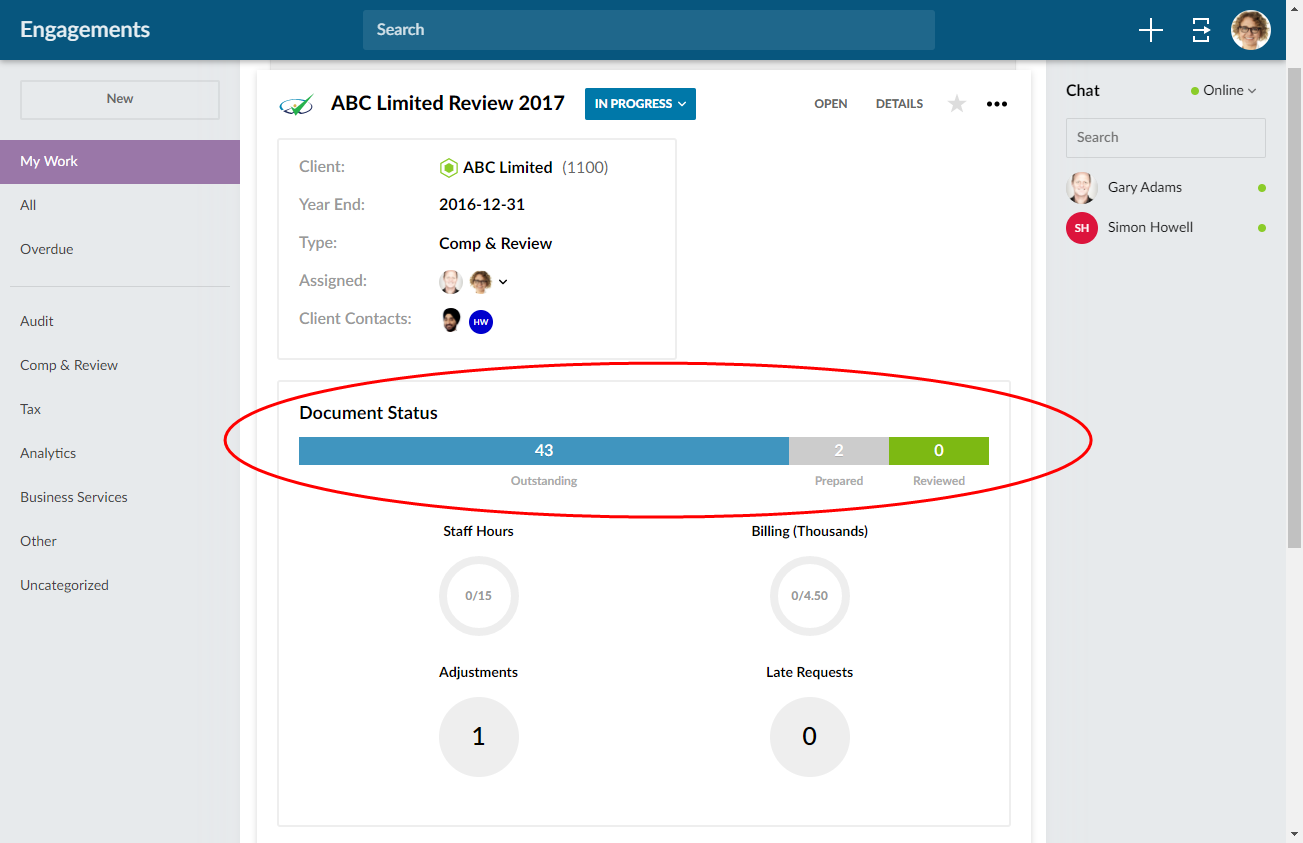 Seleccione un encargo para ampliar los detalles. En Estado del documento, puede ver un desglose del estado de todos los documentos del archivo de encargo. Si ve que hay documentos Preparados en el archivo, significa que el preparador ha firmado los documentos y ya están listos para su revisión.