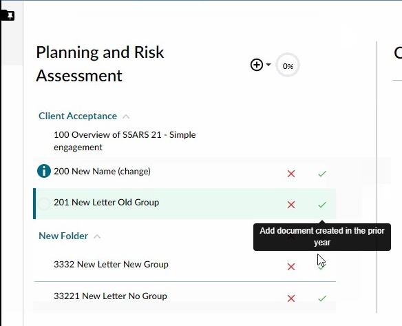 Puede arrastrar un encargo para copiar información del año anterior que no haya cambiado y utilizarla en el encargo del año en curso. Esto le permite ahorrar tiempo y evitar tener que volver a introducir información que no ha cambiado desde el año anterior. Puede aceptar todos los cambios del año pasado o aceptar algunos y trabajar sólo en los elementos individuales que han cambiado en el año en curso.