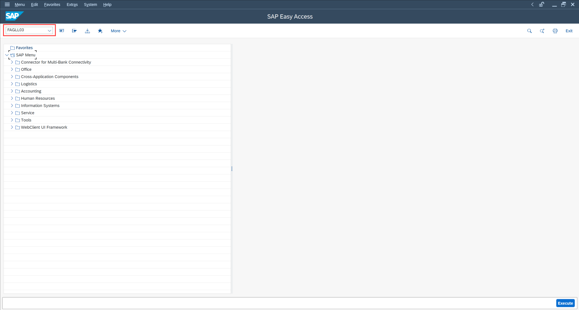 En la barra de menús de SAP, introduzca FAGLL03 como código de transacción y, a continuación, seleccione Ejecutar.