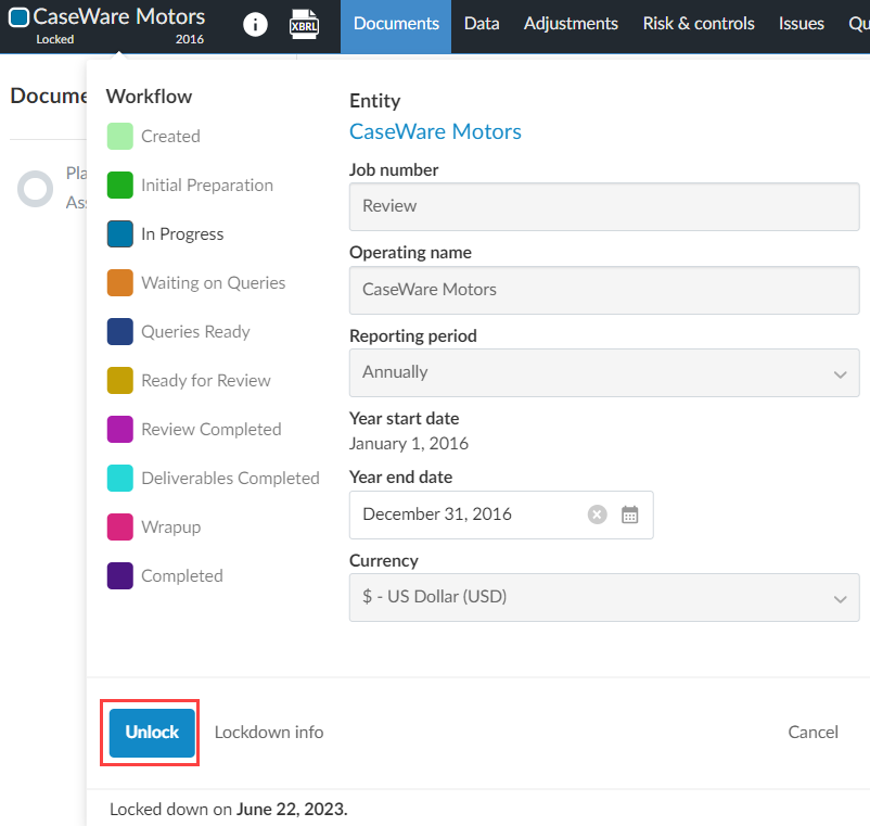 Una vez finalizado todo el trabajo sobre el encargo, puede bloquear el expediente. Seleccione el título para abrir la ventana emergente Propiedades del encargo y, a continuación, seleccione Bloqueo.