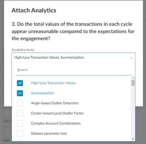 Puede enlazar con pruebas de análisis en un procedimiento de lista de comprobación. Las pruebas de análisis le permiten identificar y analizar información relacionada con los datos de su encargo y mejorar su capacidad para cumplir los objetivos de auditoría.