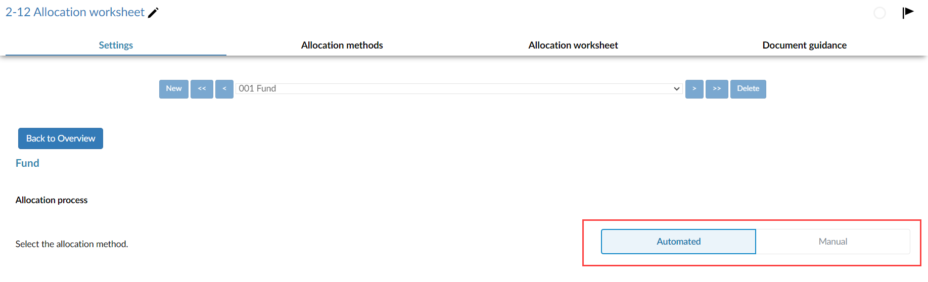 En la hoja de cálculo, observe que puede seleccionar la asignación automática o manual de sus saldos en la pestaña Configuración . Seleccione Automatizado para seleccionar sus métodos de asignación y calcular automáticamente los valores correctos para sus grupos financieros.