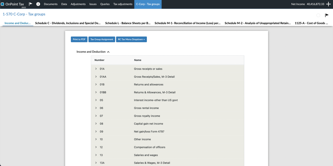 Caseware Taxflow le permite asignar grupos fiscales a sus cuentas de grupos financieros. Dependiendo de su tipo de organización, los grupos fiscales superiores están disponibles por defecto. Puede añadir, modificar o eliminar grupos fiscales utilizando el formulario 1-570 C-Corp - Grupos fiscales .