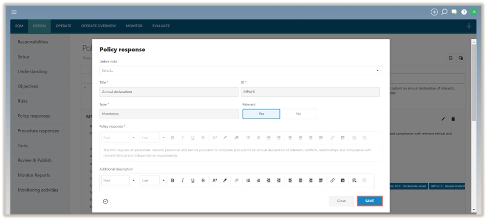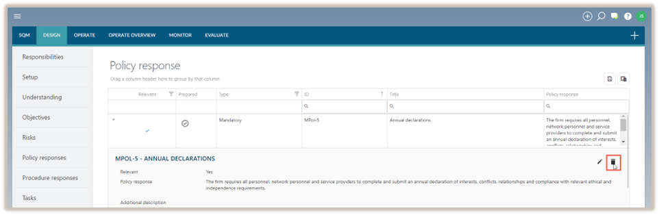 En el módulo DISEÑO , la pestaña Respuesta política es donde los diseñadores del sistema documentan las respuestas políticas de la empresa, esbozando cómo responderá la empresa a los riesgos de calidad.