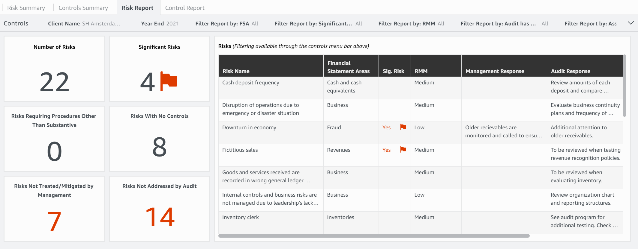 | Estados financieros Ámbitos con riesgos/riesgos significativos | Muestra el número de riesgos y riesgos significativos, para el año seleccionado, para cada Área de Estados Financieros. |