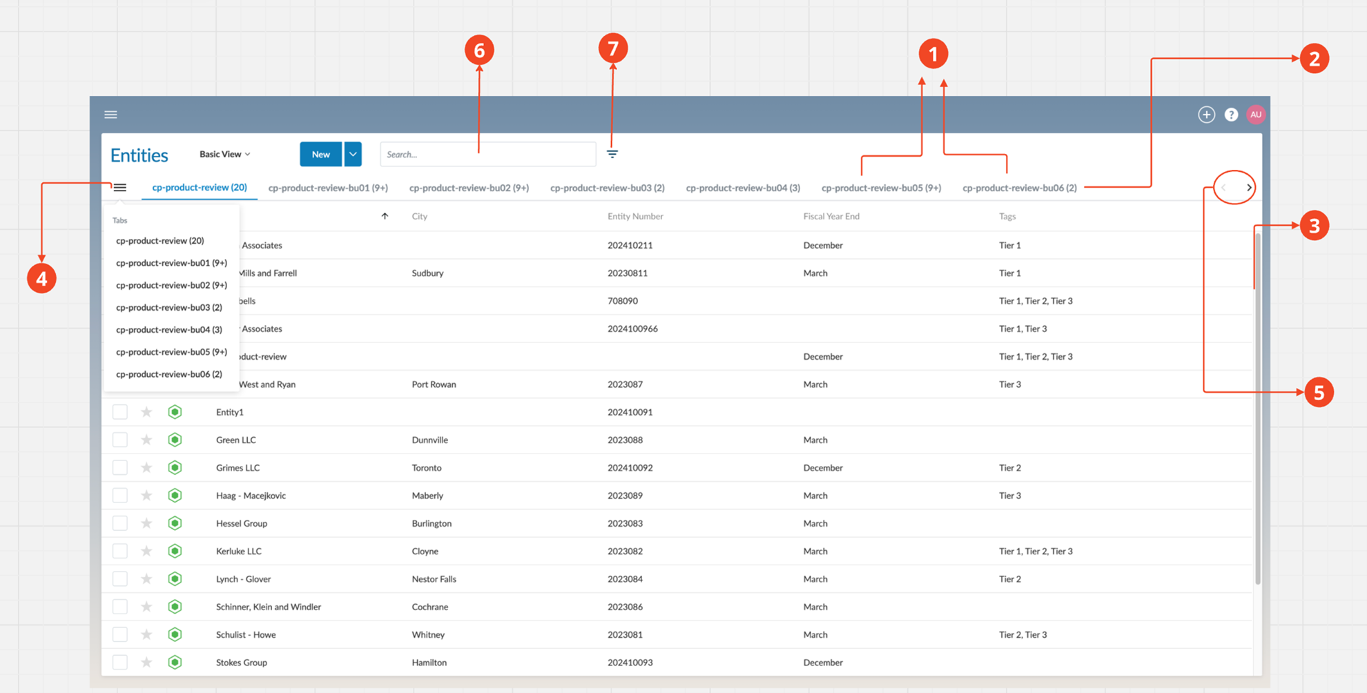 | 1 | Pestañas Cada pestaña representa una unidad de negocio específica, y los clientes dentro de cada unidad de negocio se enumerarán en estas pestañas. El nombre de cada pestaña indica los nombres de las unidades de negocio. Los usuarios verán todas las unidades de negocio en las que tienen entidades asignadas. |