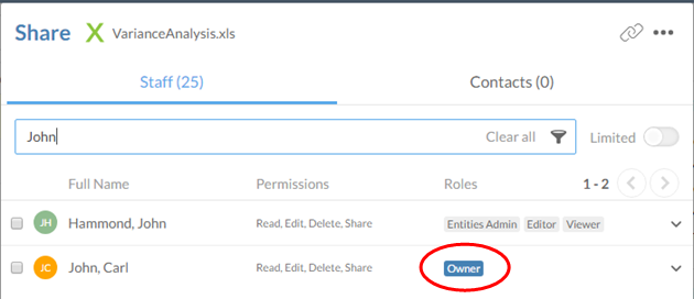 A continuación, comparte el archivo VarianceAnalysis.xlsx y asigna el rol de Propietario a Carl.