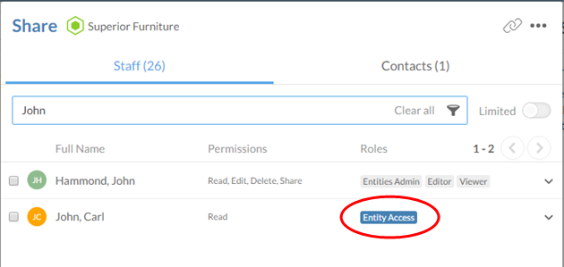 En primer lugar, asigna a Carl el rol de Acceso a Entidades en Muebles Superiores. Esto permite a Carl ver la entidad, pero no concede acceso a ningún archivo o actividad bajo la entidad.