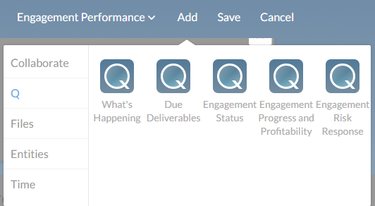 Caseware Q contient une variété de widgets intégrés, allant du suivi de l'état de votre engagement au suivi de la progression de l'engagement et de la rentabilité.