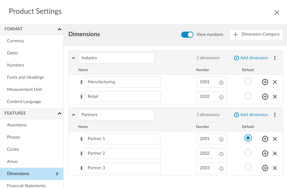 Si vous souhaitez utiliser des numéros de dimension pour attribuer un identifiant unique à chaque dimension, saisissez une valeur dans le champ Numéro. Le numéro peut être composé de lettres ou de chiffres. Ces numéros de dimension peuvent être utilisés pour associer des dimensions à des transactions.