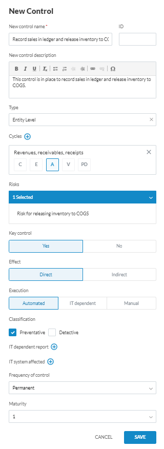 ) pour ajouter un rapport dépendant de l'informatique ou un système informatique affecté.Une fois le dialogue terminé, sélectionnez SAUVEGARDER. Votre contrôle apparaît en bas à droite de l'écran.