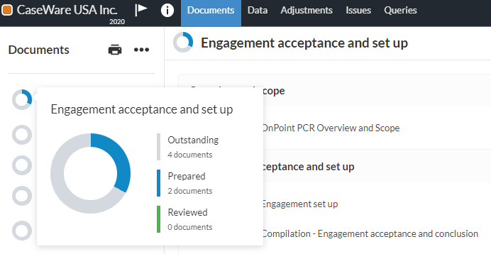 Seuls les documents et les phases applicables à votre type d'engagement sont visibles. Par exemple, si vous sélectionnez Révision comme type de mission dans la configuration de la mission 1-100, seuls les documents relatifs à une mission de révision seront visibles dans les phases mentionnées ci-dessus. Pour voir tous les documents disponibles dans OnPoint PCR, sélectionnez Plus d'actions (