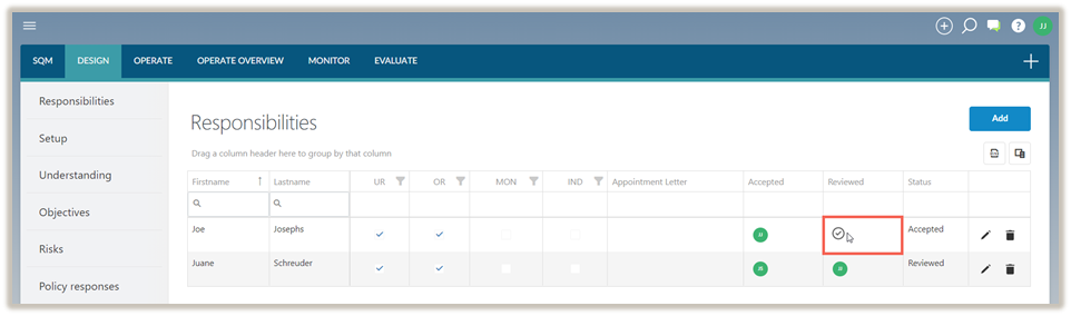 Notez que lors de la révision des responsabilités, vous pouvez accepter l'approbation dans la colonne Révisé et le statut sera mis à jour à Révisé.