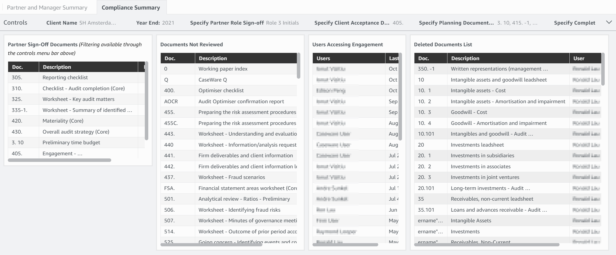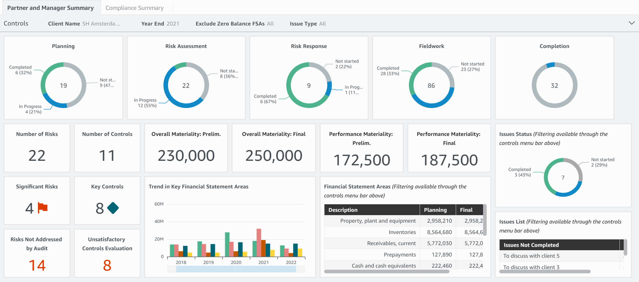 Affiche les soldes de planification, les soldes définitifs et les soldes de l'année précédente pour chaque domaine des états financiers, ainsi que leur évaluation de l'importance relative, pour l'année sélectionnée. Un filtrage supplémentaire est disponible dans la barre de contrôle.