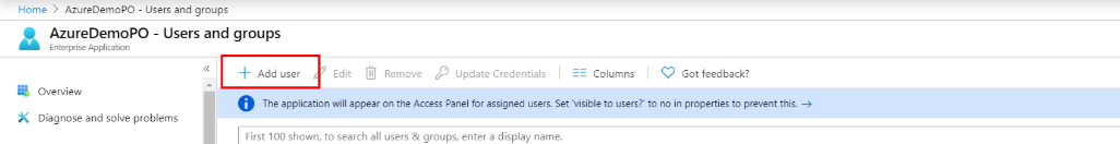 Remarque : Si vous disposez d'un compte Microsoft Azure Premium, vous pouvez créer des groupes d'utilisateurs, puis sélectionner le groupe pour accorder l'accès à tous ses membres. Pour plus d'informations, voir Créer un groupe de base et ajouter des membres à l'aide d'Azure Active Directory.