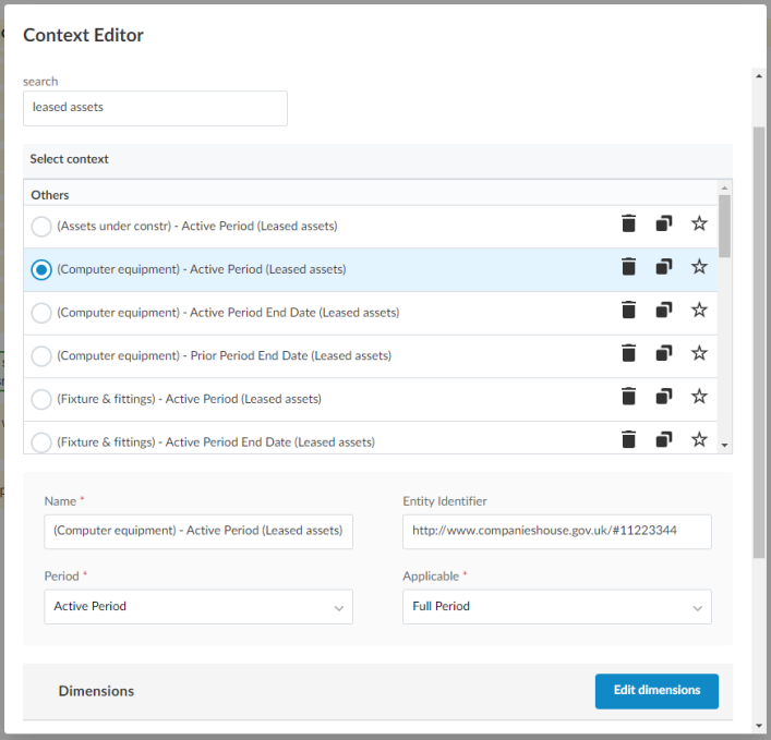 Je kunt nieuwe contexten toevoegen en bestaande contexten kopiëren vanuit het XBRL-overzichtspaneel.