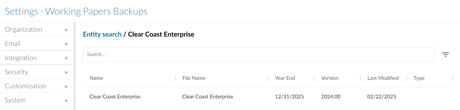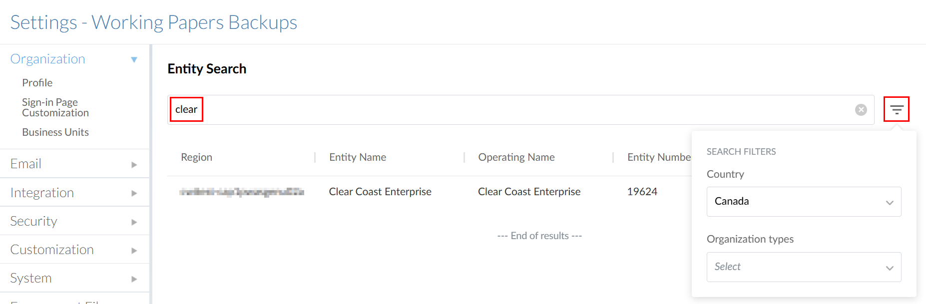 Voer in de balk Entity Search de entiteit van de client in waarvan u back-ups wilt bekijken. Je kunt de filteroptie gebruiken om de resultaten te verfijnen op land en organisatietype.