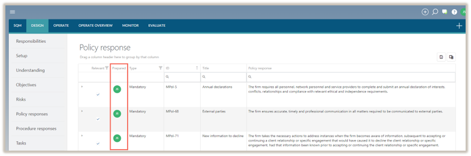 In de module ONTWERP is het tabblad Beleidsreactie waar systeemontwerpers de beleidsreacties van het bedrijf documenteren, waarin staat hoe het bedrijf zal reageren op kwaliteitsrisico's.
