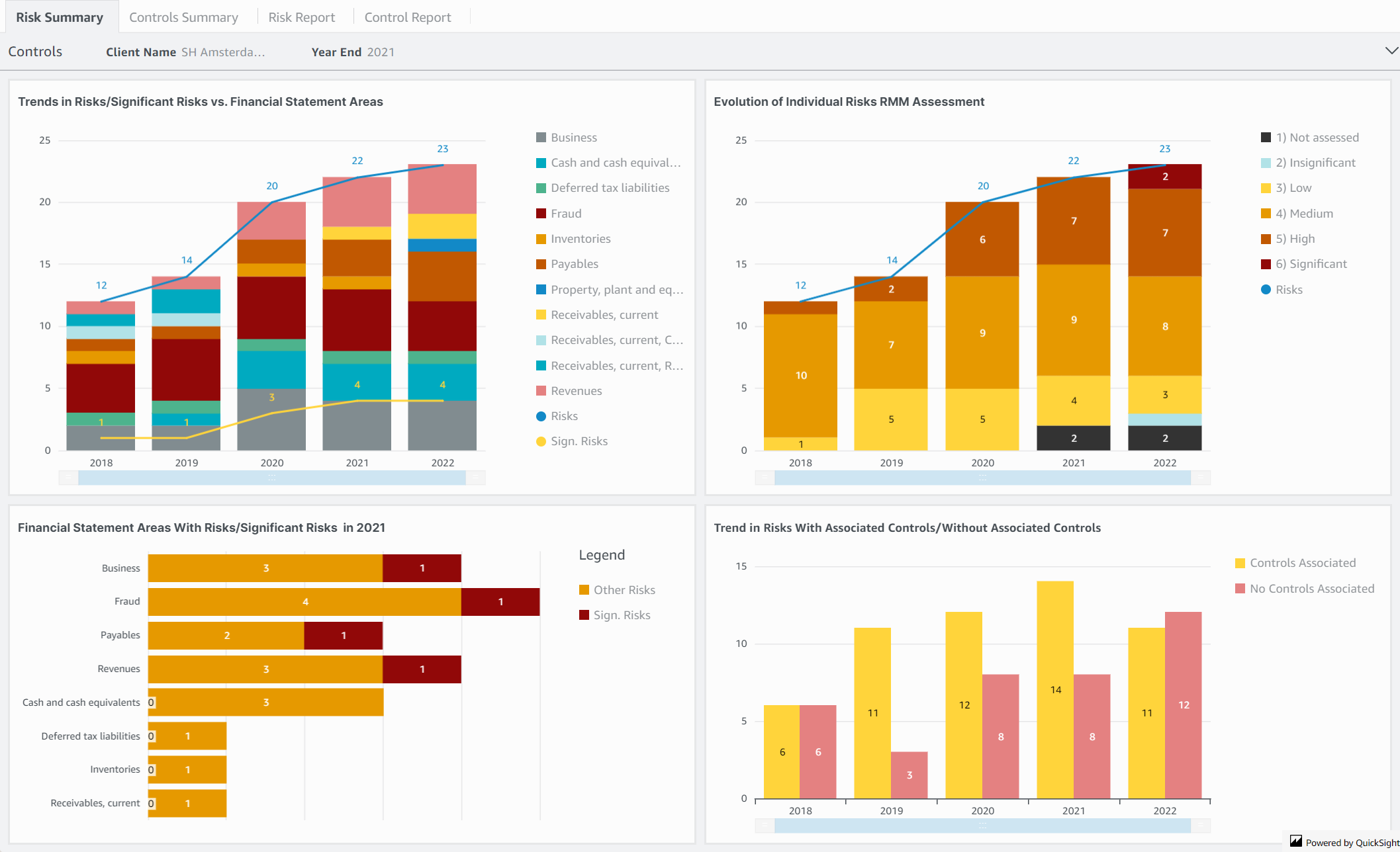 | Trends in risico's/risico's van betekenis vs. jaarrekeninggebieden | Toont het aantal risico's en significante risico's, jaar na jaar, voor elk jaarrekeninggebied. |