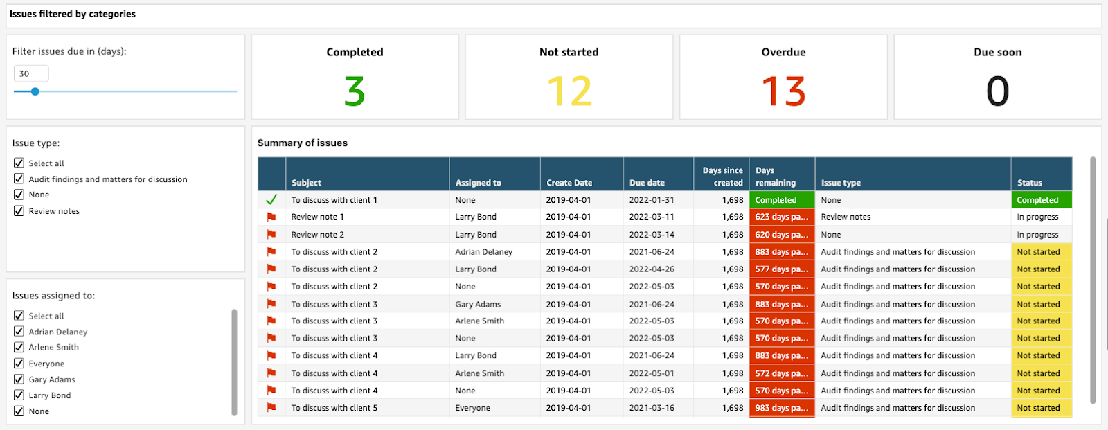 Problemen gefilterd op categorieën Hiermee kunnen gebruikers issues filteren op vervaldatum, issue-type en toegewezen issues.