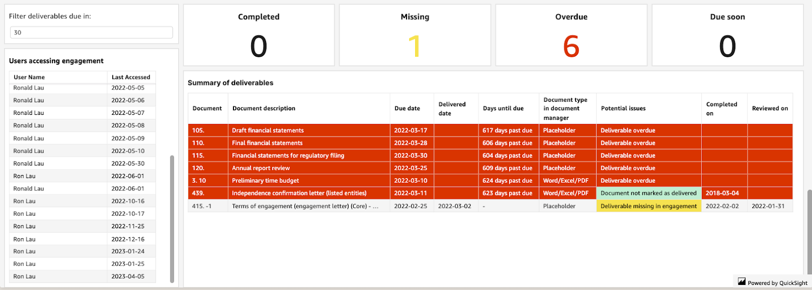 Overzicht van te leveren producten Geeft het totale aantal voltooide, ontbrekende, te laat en binnenkort te verwachten deliverables weer. Een uitsplitsing van deze problemen wordt gegeven in de tabel hieronder, inclusief details zoals de beschrijving van het document, de vervaldatum, de leverdatum, het aantal dagen dat resteert tot de vervaldatum, het documenttype dat is gedefinieerd in de documentmanager, mogelijke problemen, voltooiings- en herzieningsdatums.